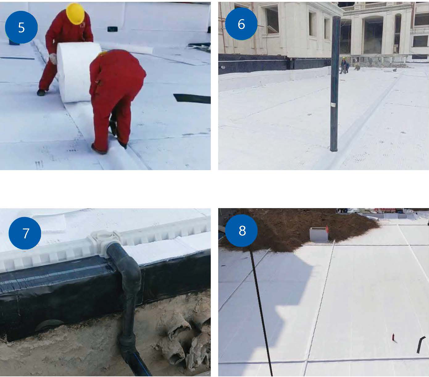 基層驗收——規劃彈線———鋪設CKF500自粘卷材—―鋪設虹吸排水槽——鋪設高分子防護異型片——安裝虹吸透氣觀察管(安裝沉淀觀察井)——接入雨水收集系統——自檢驗收——檢查驗收。