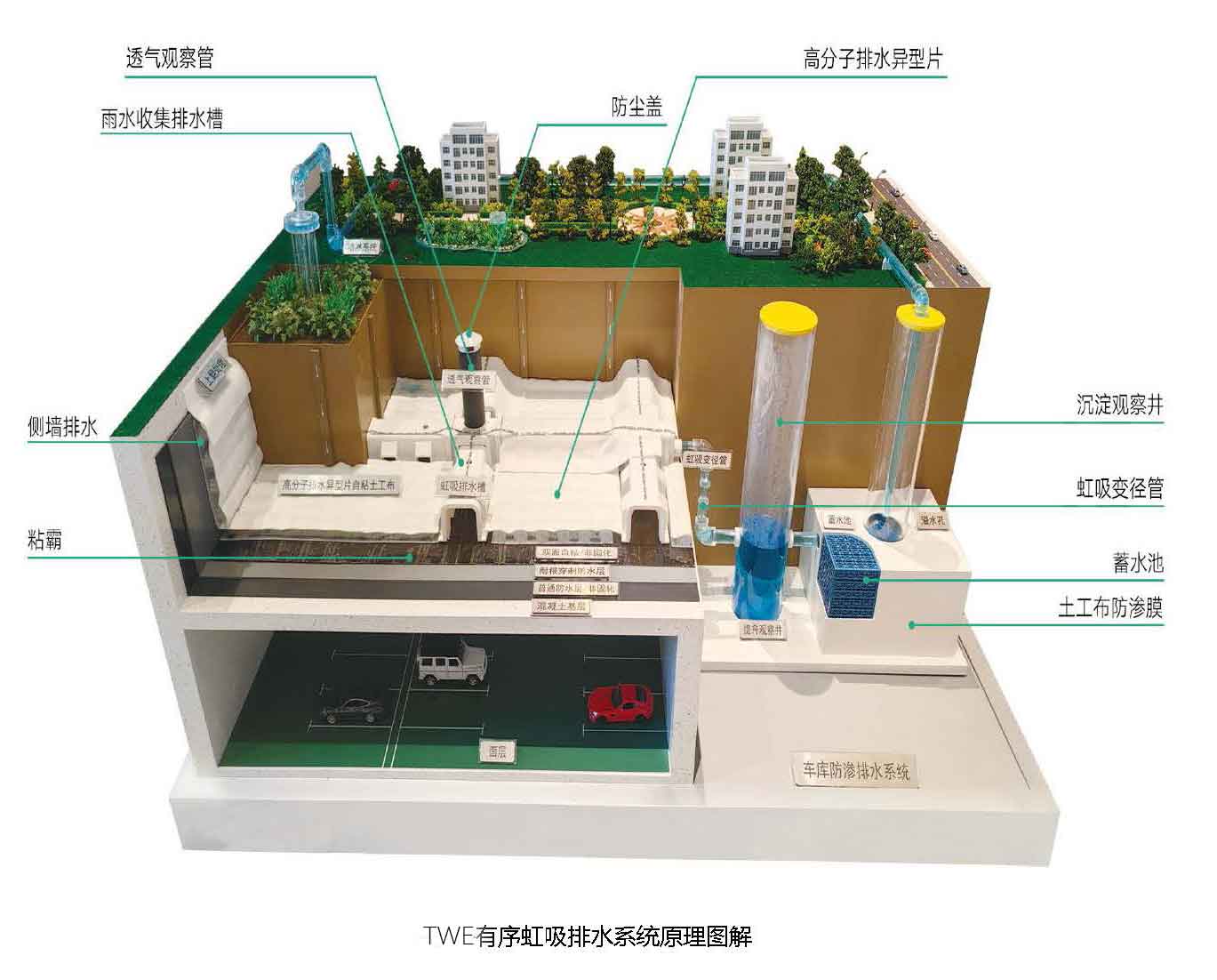 TWE有序虹吸排水系統原理:土壤中的水分通過滲透到達高分子防護排水異型片上方,水分經土工布過濾后流入高分子防護排(蓄)水異型片。水經高分子防護排(蓄)水異型片中的空隙不斷流至相鄰陷虹吸排水槽中。在虹吸排水槽上安裝透氣管,虹吸排水槽內的水在空隙、重力和氣壓作用下能很快匯集到相對應的出水口,出水口通過管道變徑的方式使虹吸直管形成滿流從而形成虹吸,在虹吸作用下,排水槽內的水不斷被吸入沉淀觀察井,流出頂板區域。流出的水分經觀察井排入雨水收集系統內,待晴天需要對綠化植物進行澆灌時再對雨水進行循王環利用。