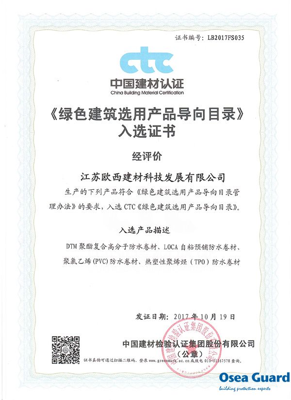 近日,歐西家建科四款產品“DTM聚酯復合防水卷材”、“LOCA自粘預鋪防水卷材”、“聚氯乙烯(PVC)防水卷材”、“熱塑性聚烯烴(TPO)防水卷材”獲得國家建筑材料測試中心頒發的《綠色建筑選用產品證明商標準用證》,并經中國建材檢驗認證集團評價成功入選《綠色建筑選用產品導向目錄》。
