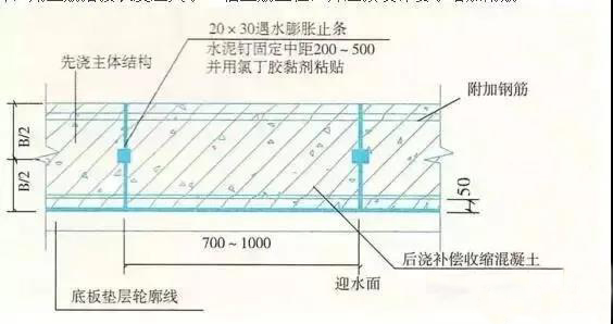 2、水平施工縫澆筑混凝土前,應(yīng)將其表面浮漿和雜物清除,然后鋪設(shè)凈漿或涂刷混凝土界面處理劑、水泥基滲透結(jié)晶性防水涂料等材料,再鋪30~50mm厚1:1水泥砂漿,并及時(shí)澆灌混凝土。