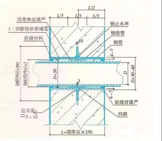 3、結(jié)構(gòu)變形縫或管道伸縮量較大或有更換要求時(shí),應(yīng)采用套管式防水法,套管應(yīng)加焊止水環(huán)。