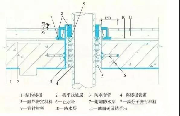(4)穿樓板管道應(yīng)設(shè)置止水套管或其他止水措施,套管直徑應(yīng)比管道大1~2級(jí)標(biāo)準(zhǔn);套管高度應(yīng)高出裝飾地面20~50mm。套管與管道間用阻燃密實(shí)材料填實(shí),上口應(yīng)留10~20mm凹槽嵌入高分子彈性密實(shí)材料。用于熱水管防水處理防水材料和輔料,應(yīng)具有相應(yīng)耐熱性能。