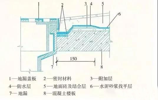 (2)地漏與地面混凝土間應(yīng)留置凹槽,用合成高分子密封膠進(jìn)行密封防水處理。地漏四周應(yīng)設(shè)置加強(qiáng)防水層,加強(qiáng)寬度不應(yīng)小于150mm。防水層在地漏收頭處,應(yīng)用合成高分子密封膠進(jìn)行密封防水處理。