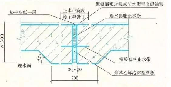 1、防水混凝土應(yīng)連續(xù)澆筑,需要留設(shè)施工縫時(shí),墻體水平施工縫應(yīng)留在高出底板表面不小于300mm的墻體上;拱(板)墻結(jié)合的水平施工縫宜留在拱(板)墻接縫線(xiàn)以下150mm~300mm處;墻體有預(yù)留孔洞時(shí),施工縫距孔洞邊緣不宜小于300mm。垂直施工縫應(yīng)避開(kāi)地下水和裂隙水較多的地段,并宜與變形縫相結(jié)合。