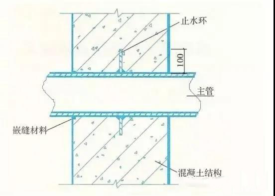 2、結(jié)構(gòu)變形或管道伸縮量較小時(shí),穿墻管可采用主管直接埋入混凝土內(nèi)的固定式防水法,并應(yīng)預(yù)留凹槽,槽內(nèi)用嵌縫材料嵌填密實(shí)。