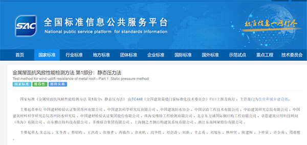 2021年3月9日,國家市場監督管理總局(國家標準化管理委員會)發布國家標準公告(2021年第3號),公告批準頒布了等362項推薦性國家標準,包括GB/T 39794.1-2021《金屬屋面抗風掀性能檢測方法 第1部分 靜態壓力法》、GB/T 39794.2-2021《金屬屋面抗風掀性能檢測方法 第2部分 動態壓力法》兩個國家標準。標準由中國建材檢驗認證集團蘇州有限公司和中國建筑科學研究院有限公司分別牽頭,中國建筑防水協會、中冶建筑研究總院有限公司等參加起草。