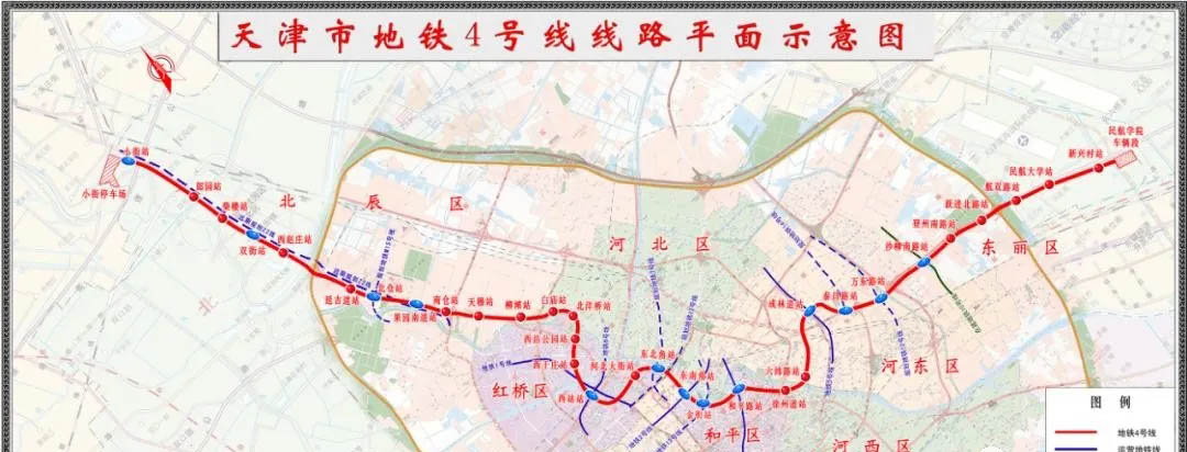 天津地鐵4號線PPP項目北段工程北起北辰區小街,南至紅橋區河北大街。沿線經過北辰區、河北區、紅橋區3個行政區。正線全長約22km,設17座車站,均為地下站,設小街停車場和1座主變電所,控制中心接入天津軌道交通指揮中心(華苑綜合控制中心)