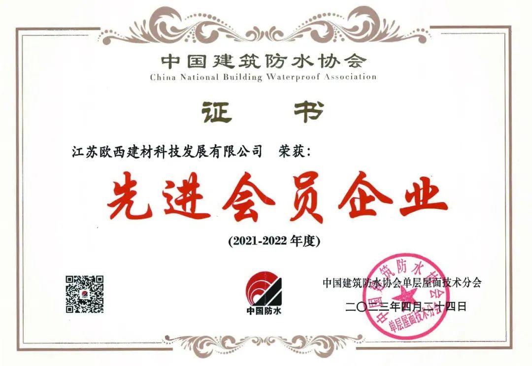 此次“先進會員企業獎”的獲得是對歐西過去幾年成就的肯定,更是對歐西今后發展的鞭策和激勵。未來,歐西將擴大高分子防水卷材的優勢,不斷提高核心競爭力,為推動單層屋面防水事業的持續發展持續做出貢獻。
