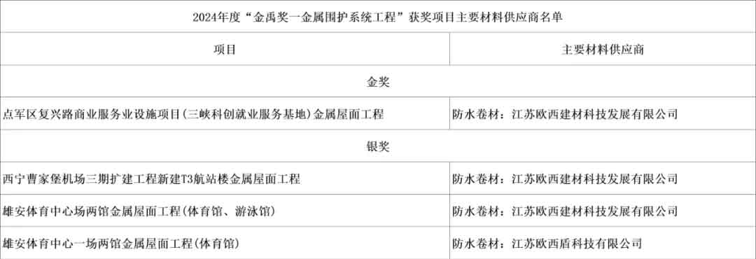 在2024年度建筑防水行業的重磅評選——“建筑防水行業科學技術獎—工程技術獎(金禹獎—金屬圍護系統工程)”中,歐西盾防水卷材成功入選獲獎項目主要材料供應商名單。該獎項由中國建筑防水協會與《中國建筑防水》雜志社聯合評定,是全國金屬圍護系統行業優秀工程項目的至高榮譽,每年評定一次,旨在表彰行業內最頂尖的工程項目與材料供應商。此次榮獲獎的四個項目,無一不是行業內的標桿性建筑,而它們背后都有著歐西盾防水卷材的堅實支撐。