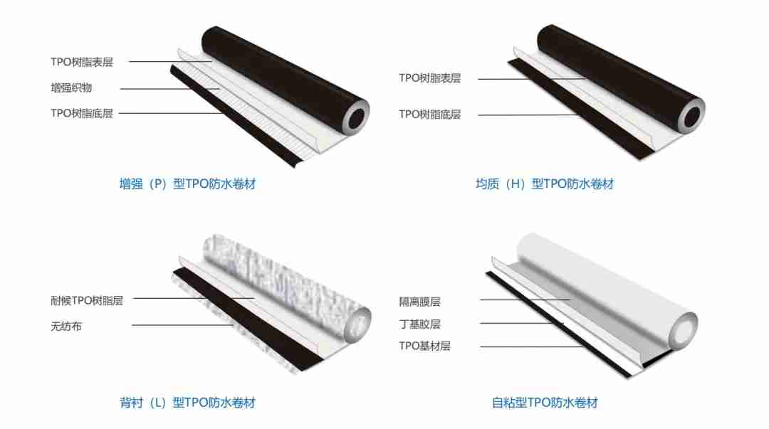 熱塑性聚烯烴(TPO)防水卷材是采用特殊的共混技術將乙丙橡膠與聚丙烯聚合在一起,添加抗氧劑、光穩定劑、高效阻燃劑等助劑,通過擠出工藝制成的新型防水卷材。卷材不含有毒有害物質,屬于綠色環保的防水卷材。